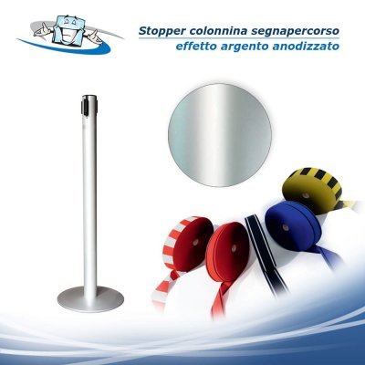 Colonnina segnapercorso con nastro estraibile e 3 agganci per nastri da altre colonnine. Il nastro in tessuto sintetico è antipiega,...