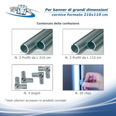 • 6 dimensioni standard disponibili - Su richiesta anche misure personalizzate • Ogni confezione include: - N. 4 profili in alluminio - N. 4 angoli - Clips - Connettori - Connettori non necessari e non inclusi per la misura 210x110 cm - Vedi ulteriori informazioni e specifiche nella scheda tecnica in basso