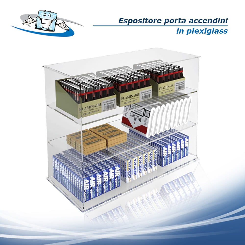 Espositore da banco in plexiglass trasparente per tabaccherie e affini. Per esporre in maniera ordinata diversi prodotti: accendini, caramelle, chewing gum, tabacco, cartine, piccoli gadget, ecc.
