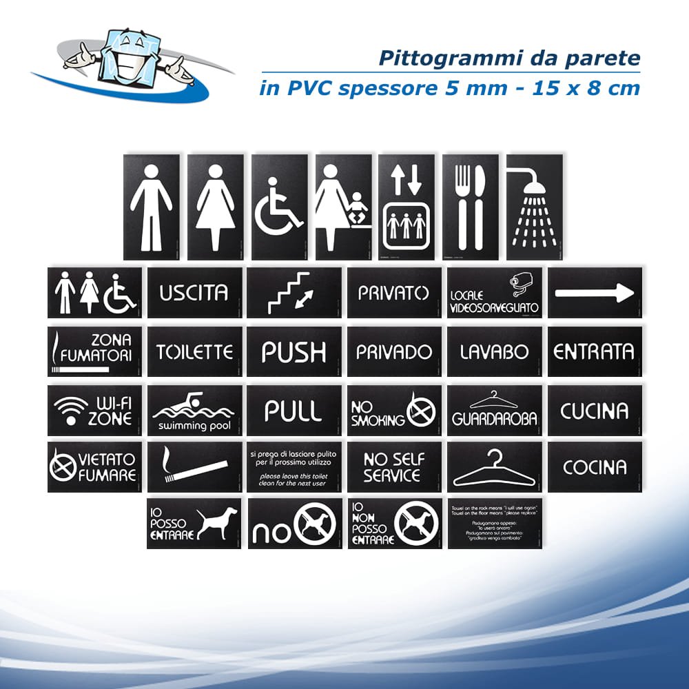 Biadesivo incluso: pittogrammi da parete in PVC spessore 5 mm, provvisti di bollini biadesivi ad alta tenuta, adatti per applicazione su superfici "compatte".