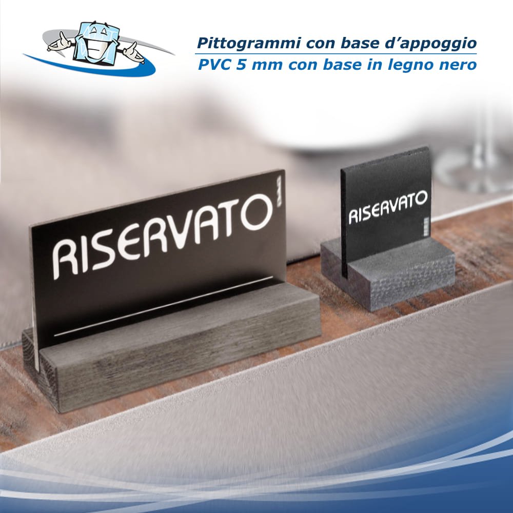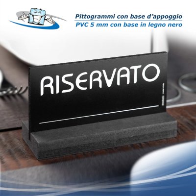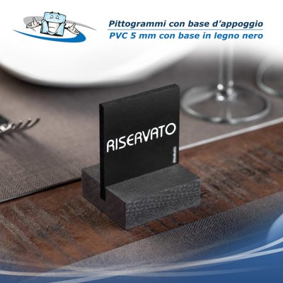 Eleganti pittogrammi con supporto in legno, adatti per applicazione sui tavoli dei ristoranti per riservare i tavoli. Le serigrafie colore bianco su base nera, li rendono perfetti per tutte le tipologie di locale.