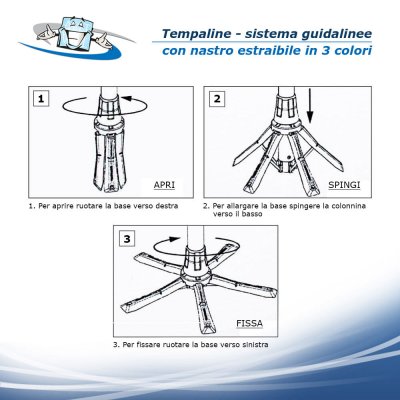 Tempaline è il primo sistema guidalinee con base pieghevole: una soluzione semplice, rapida e trasportabile. La base si apre con un unico movimento della mano. Il nastro si estrae dal meccanismo avvolginastro e si aggancia alla colonnina successiva. Ottima stabilità e poco volume d’ingombro per il trasporto e lo stoccaggio. Adatto sia per uso interno che esterno.
